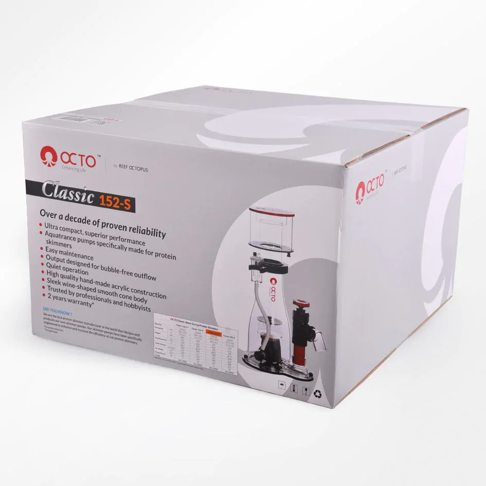 The 152S Classic Protein Skimmer by Reef Octopus offers refined filtration for aquariums up to 150 gallons, featuring a Super Cone body design and an ultra-efficient Aqua-trance 1800s pump for quiet and effective operation. This 152S Classic Protein Skimmer is constructed of high-quality cast acrylic that disassembles completely for cleaning. Its unique Super Cone "wine glass shape" body naturally stabilizes and concentrates the organic rich foam as it rises producing an enhanced foamation.Product Features: