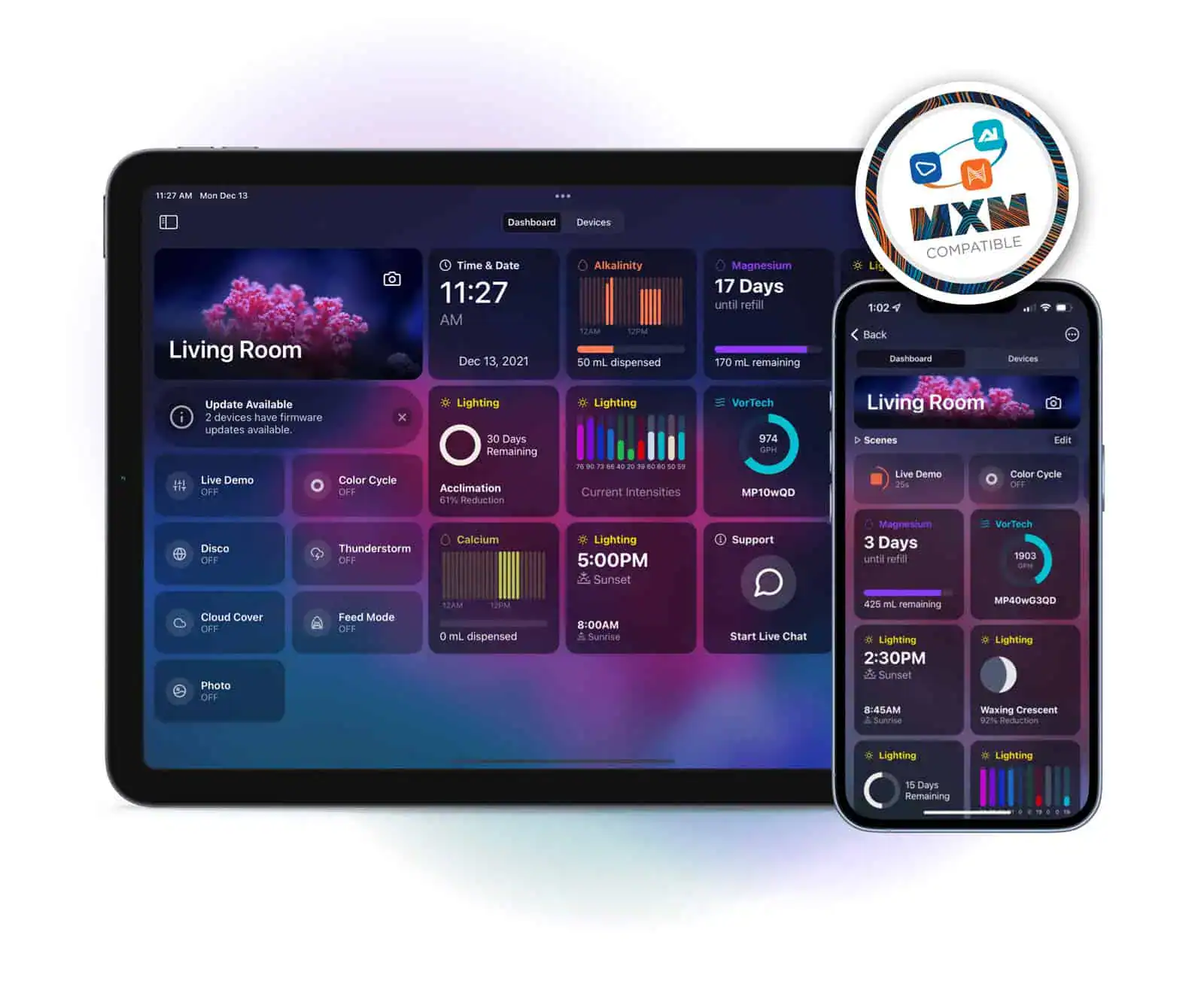 Control the AI Prime 16 LED through the MyAI app on iOS or Android. The setup takes minutes, and adjustments are seamless. For advanced aquarists, MXM compatibility integrates Aquaillumination, EcoTech Marine, and Neptune Systems gear into Apex Fusion, consolidating device management into a single interface.