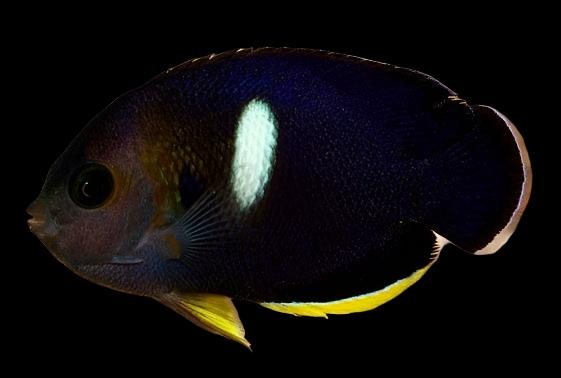 The Keyhole Angelfish is a hardy, mid-sized dwarf angelfish known for its distinct black body and white keyhole marking. Ideal for larger marine aquariums, it grazes on algae but may occasionally nip at corals, making it best suited for fish-only or cautiously monitored reef setups.