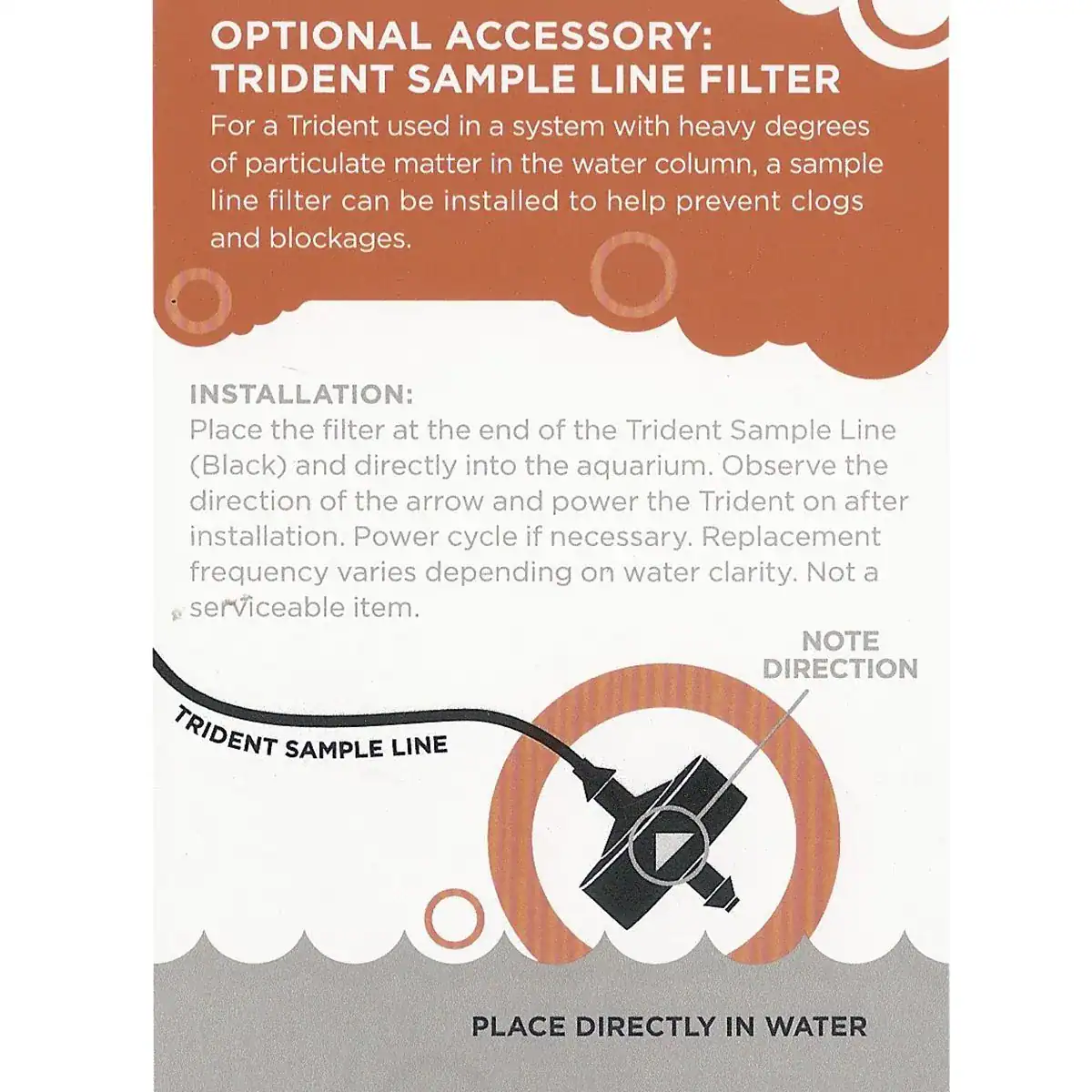 Place the filter at the end of the Trident Sample Line (Black) and directly into your aquarium. Observer the direction of the arrow and power the Trident on after installation. You can power cycle is necessary. Replacement frequency can vary depending on water clarity. **PLEASE NOTE**: This is not a serviceable item.More to Check Out